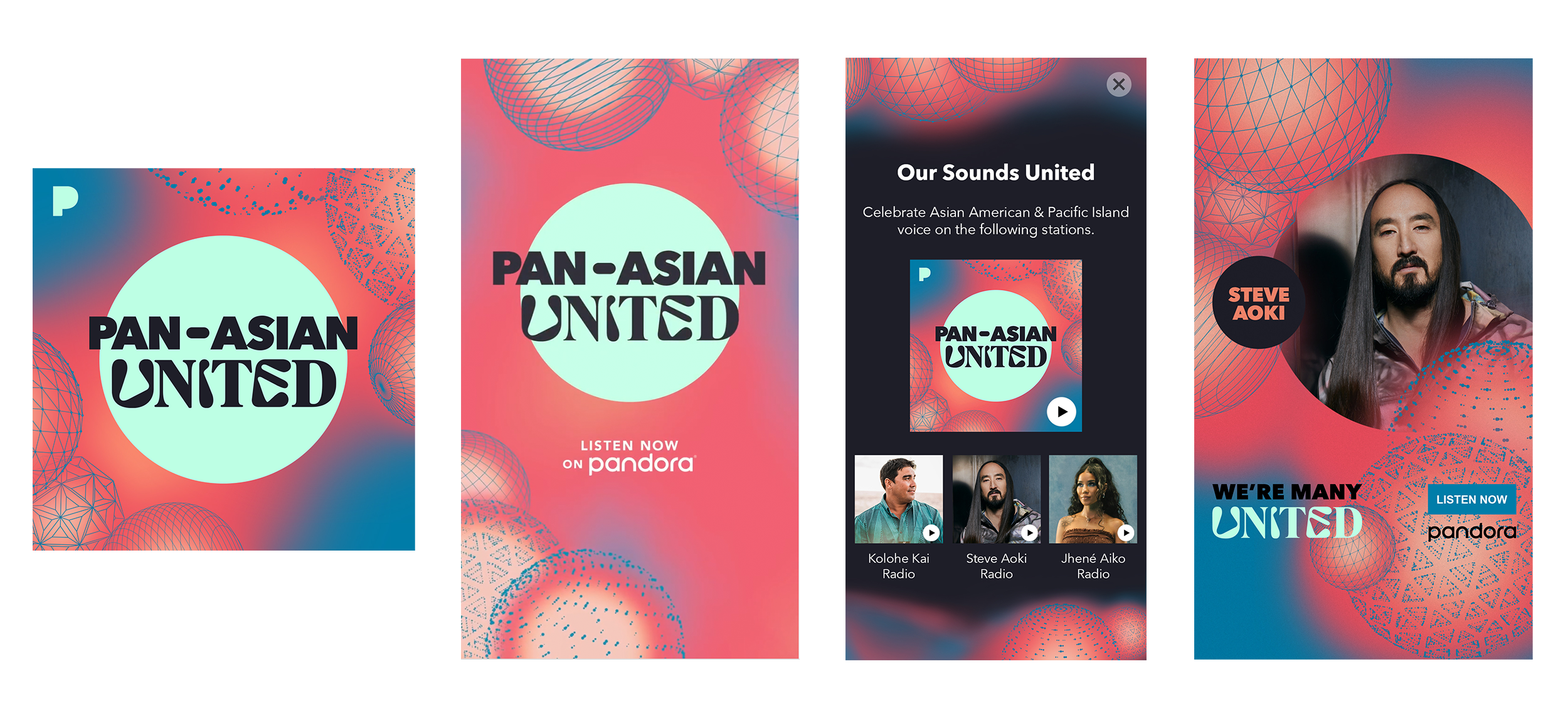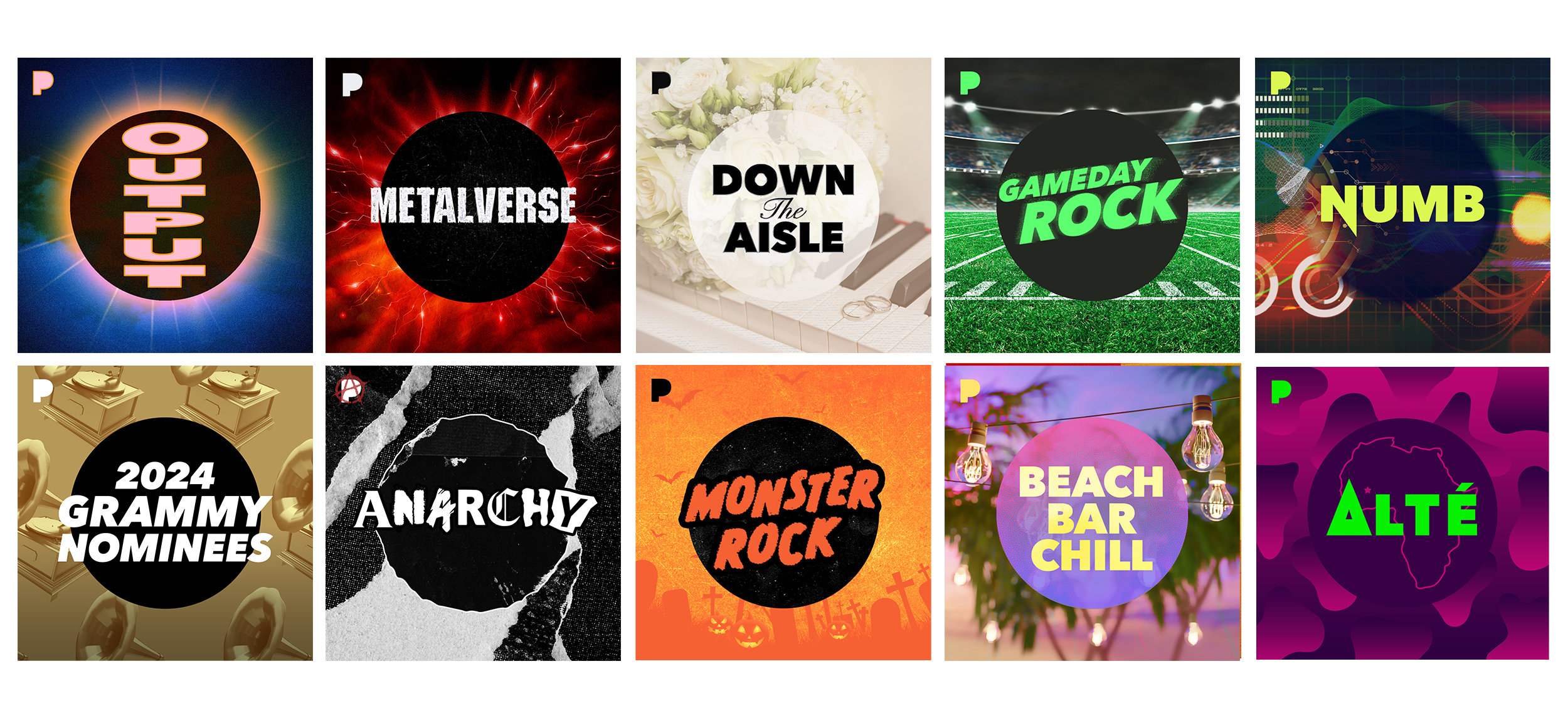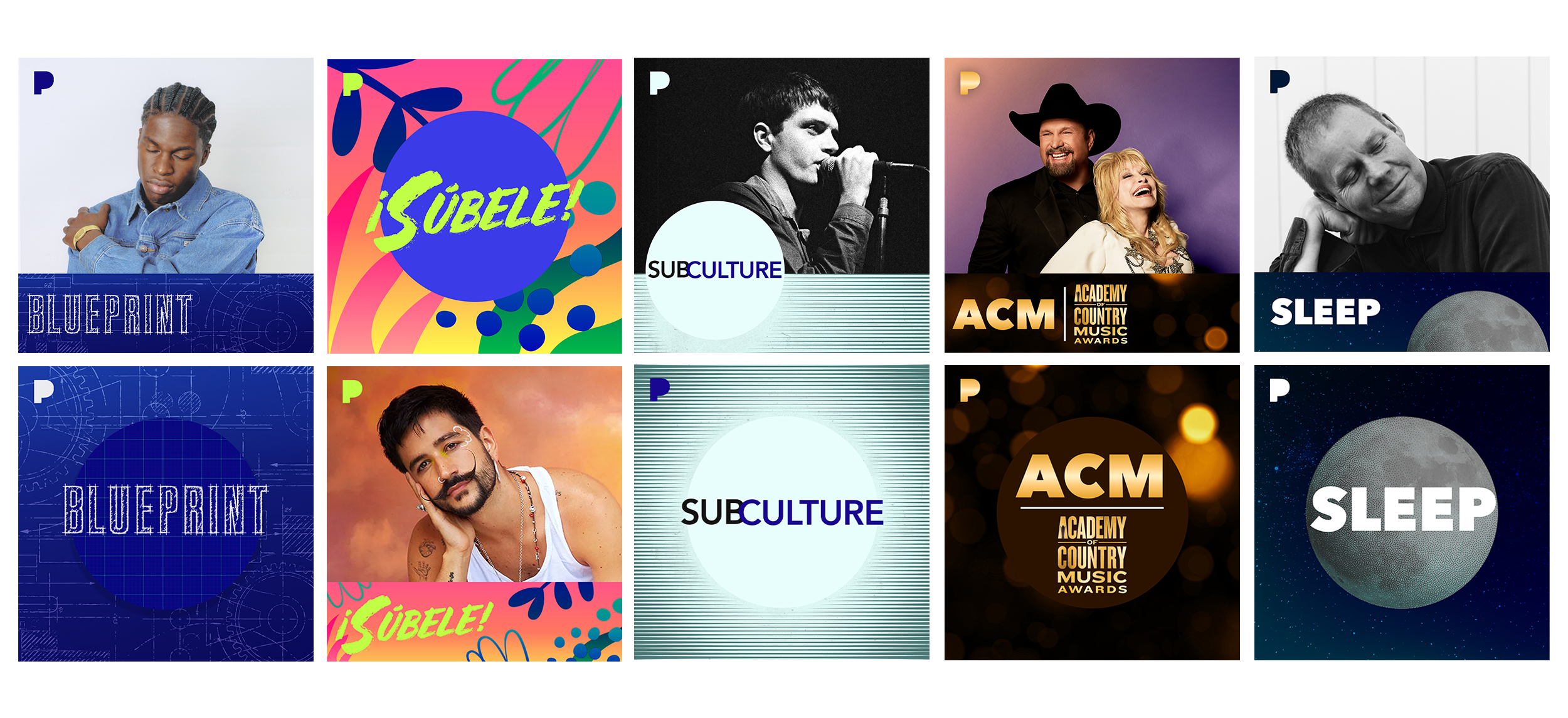 Playlist tiles are important to Pandora's business. This design system is flexible and scalable, allowing for the ongoing creation of standard and more custom 1x1 artwork for each station, playlist, and mixtape, all produced in-house. Each tile request has unique needs and challenges, which require clear communication with the requesters.